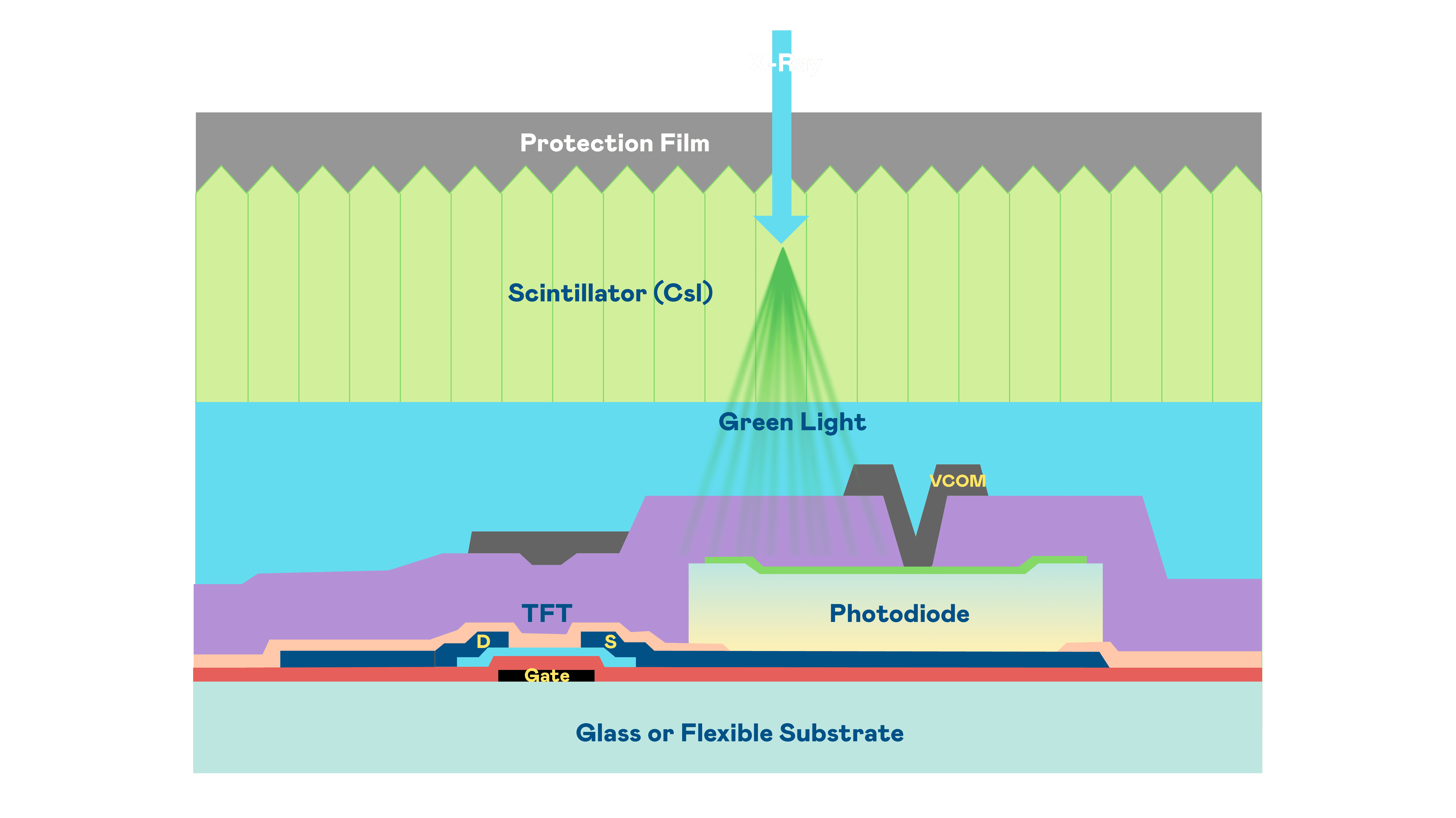 蓝狮在线的X光影像感测阵列使用薄膜电晶体 (TFT) 作为每个像素的读取开关,,,,搭配光电二极体(Photodiode)的光电转换元件,,,,用以感测X光影像讯号。。